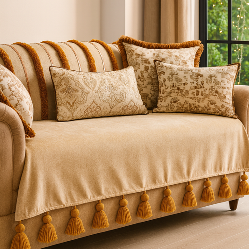 Perfect Fit & Stylish Protection � 4-Seater Sofa Cover With Tassels � Enhance your living room with this premium 4-seater sofa throw cover (65W X 170L cm, 1 Piece) Multi-Purpose & Anti-Slip Design � This boho-chic tassel sofa cover for 4-seater sofas anti-slip sofa protector, and decorative sofa throw. Premium Fabric � Easy to Maintain & Long-Lasting � Crafted for scratch, fade, and shrink resistance, this 4-seater sofa cover with tassels blends bohemian charm with practical durability. Customize Your Sofa Cover � Easy Selection Guide We offer a few optional add-ons so you can design your sofa cover exactly the way you want. Simply select your preference from the drop-down options. Add Tassel / Pleats (Decorative Finish) This option lets you choose how the bottom edge of the sofa cover will look. Available options: Add Corner Tassels � Decorative tassels added only at the four corners of the sofa cover. Add Non-Removable Tassels � Tassels stitched permanently to the sofa cover and cannot be removed. Add Removable Tassels � Tassels that can be attached or removed as needed. Add Box Pleats � Fabric pleats instead of tassels for a neat, tailored, hotel-style finish. Choose this option if you want to enhance the overall style and appearance of your sofa. Add Armrest Covers This option allows you to include covers for the sofa armrests. Available options: Not Required � Only the main sofa cover will be provided. Armrest with Tassels � Separate armrest covers with matching tassels for a coordinated look. This is recommended if your armrests are frequently used or prone to stains. Add Water-Resistant Lining This option adds an inner protective layer beneath the fabric. Available options: Not Required � Standard fabric without additional lining. Add Water-Resistant Lining � Extra lining that helps protect the sofa from spills, stains, and moisture. Ideal for homes with children, pets, or frequent food and drink use.
