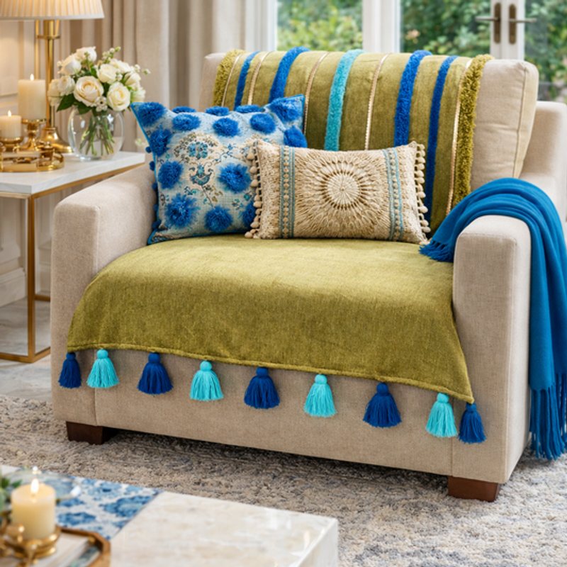 "When choosing a sofa cover, consider the balance between color and texture. A solid color with tassels can be an elegant statement piece that works well with neutral-toned rugs and wooden furniture,"