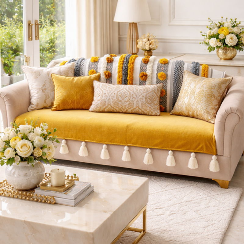 Yellow 5 Seater Sofa Cover With Tassels |Tassel Sofa Throw 3+2 Seater Set