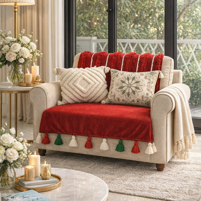 Elevate your Valentine's Day decor by incorporating a throw in neutral or peach tones, harmonizing with the romantic theme.