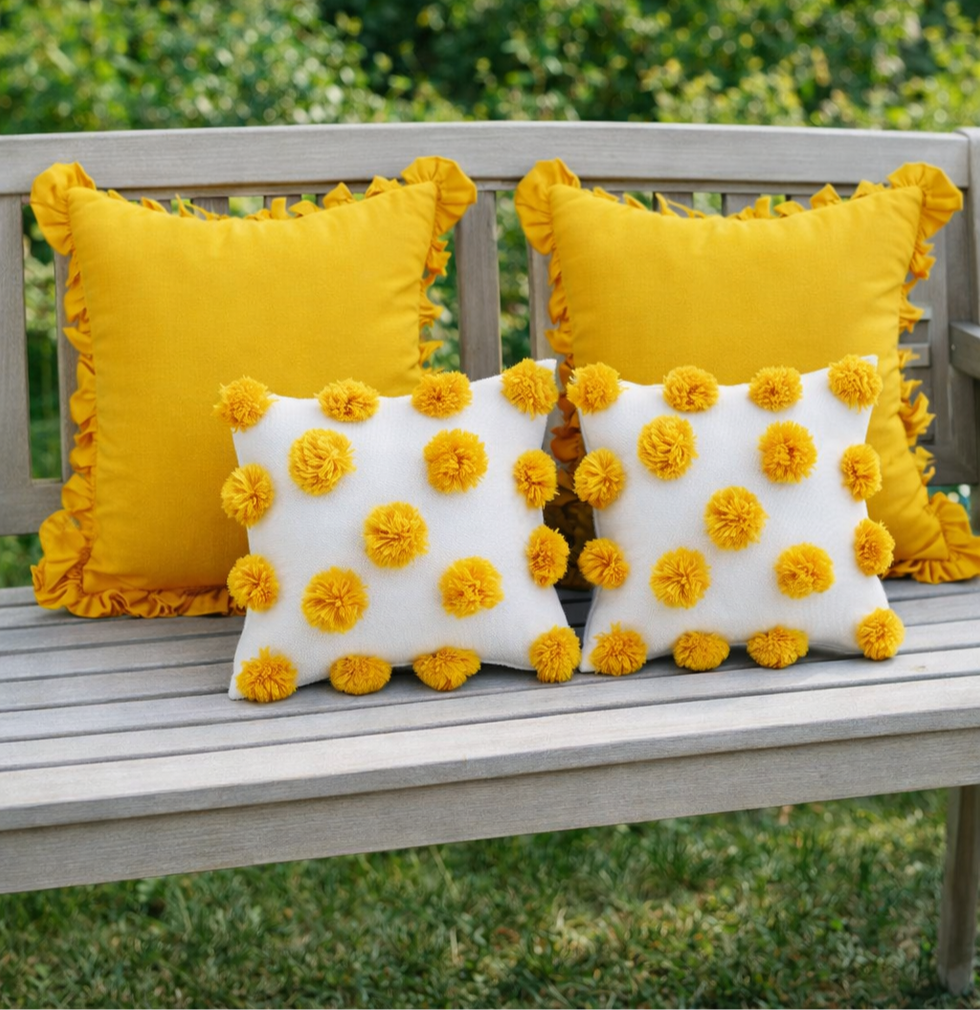 White Cushion Covers with Yellow Pom Poms (2 pieces, 16x16 inches)