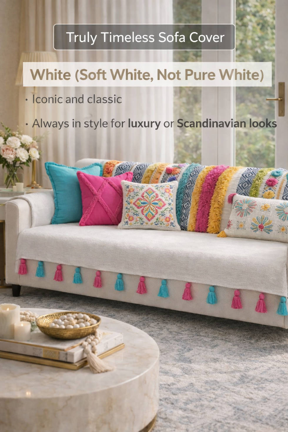 Soft white sofa covers are iconic and always in style, especially for luxury or Scandinavian looks. Unlike pure white, soft white has a warmer tone that feels inviting.